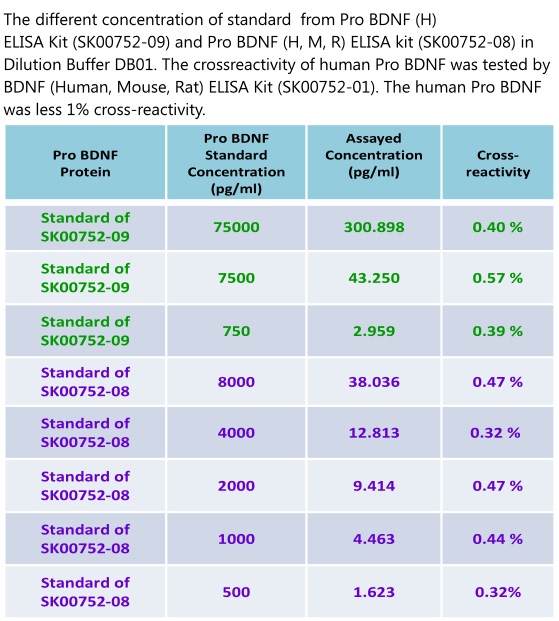 Specificifty: Mature human BDNF at 100%. Pro BDNF (Human) derived from human cells indicated less 1% crossreactivity.